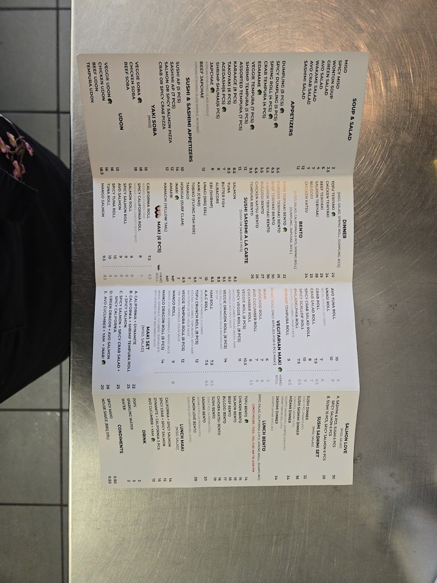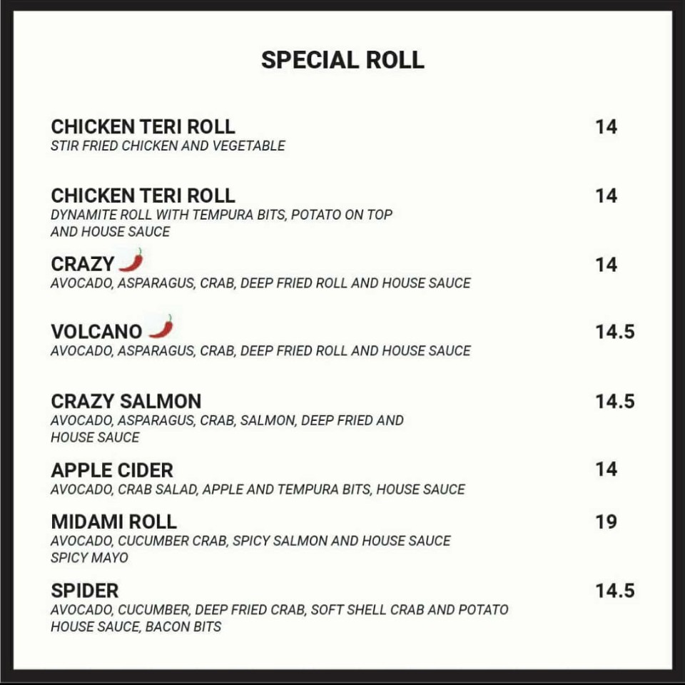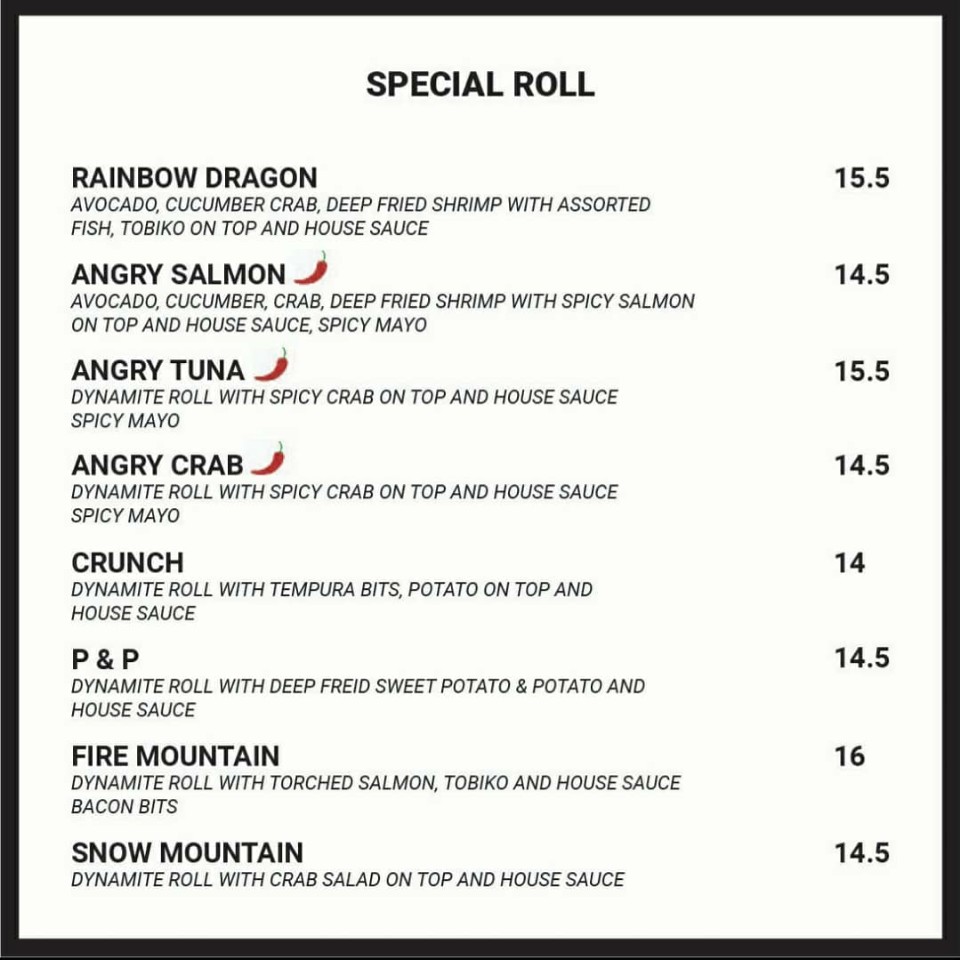 California, spicy salmon, dynamite, crab salad roll, yam roll, shrimp tempura roll, green dragon, crazy, spider, angry crab, Alaska, avo salmon, Philadelphia (total 90 pcs),.
